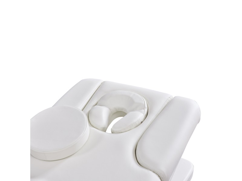 Раскладывается до горизонтального положения, комплектуется 3-мя подголовниками, в верхней части расположено отверстие для лица и съемные подлокотники.