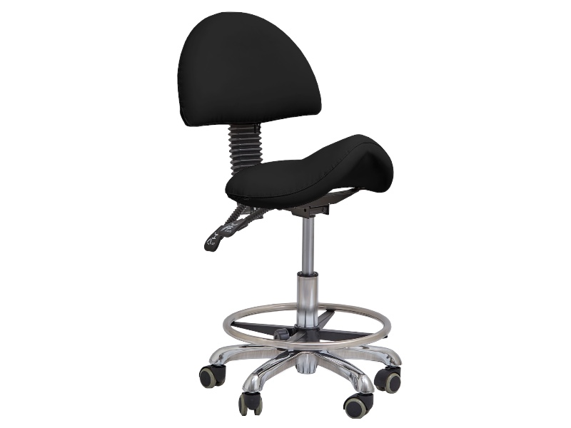 Стул-седло модель 018 черного цвета со спинкой и регулируемой высотой имеет 3 регулирующих механизма для изменения высоты стула и высоты спинки, а также для изменения угла наклона спинки. Стул оснащен подставкой для стоп, которую можно отрегулировать по высоте.