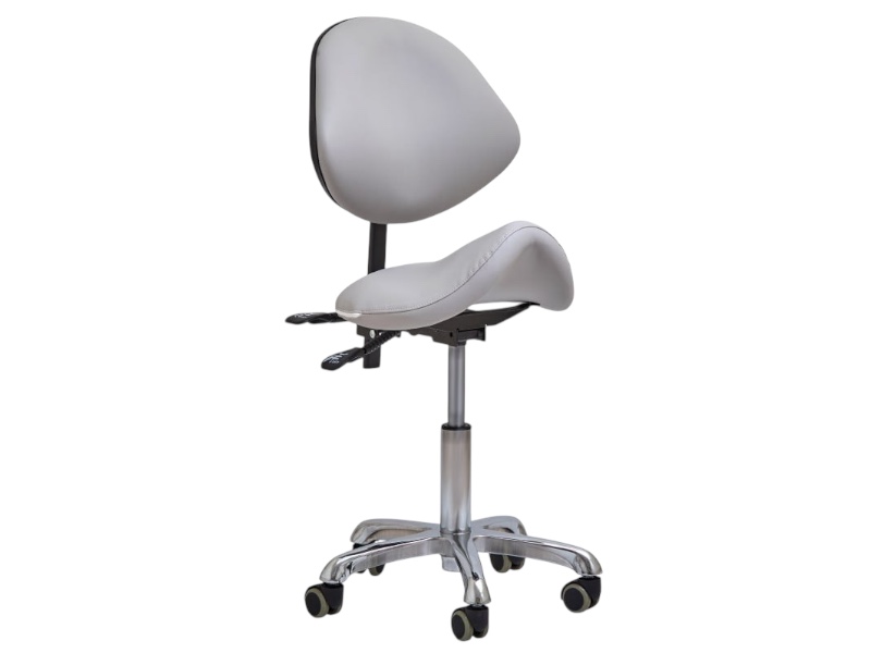 Стілець-сідло модель 053 білого кольору для майстра зі зручною елегантною спинкою має 3 механізми регулювання для зміни висоти стільця, кута нахилу спинки і висоти спинки. Дозволяє підібрати найзручніше положення для майстра.