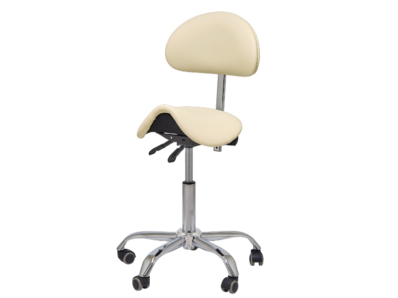 Стілець-сідло модель 1037-6 бежевого кольору для майстра зі зручною елегантною спинкою має 3 механізми регулювання для зміни висоти стільця, кута нахилу спинки і висоти спинки. Дозволяє підібрати найзручніше положення для майстра.