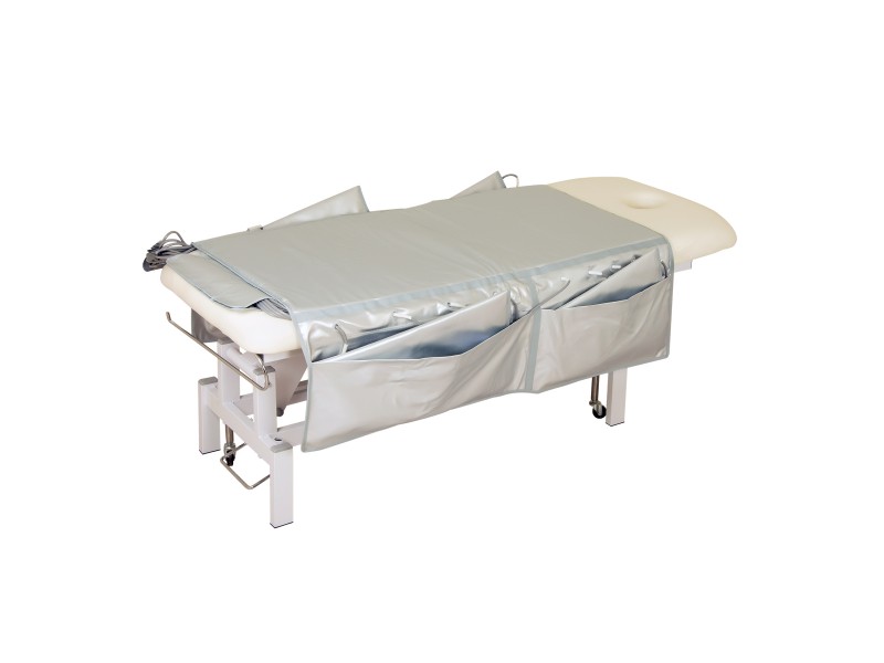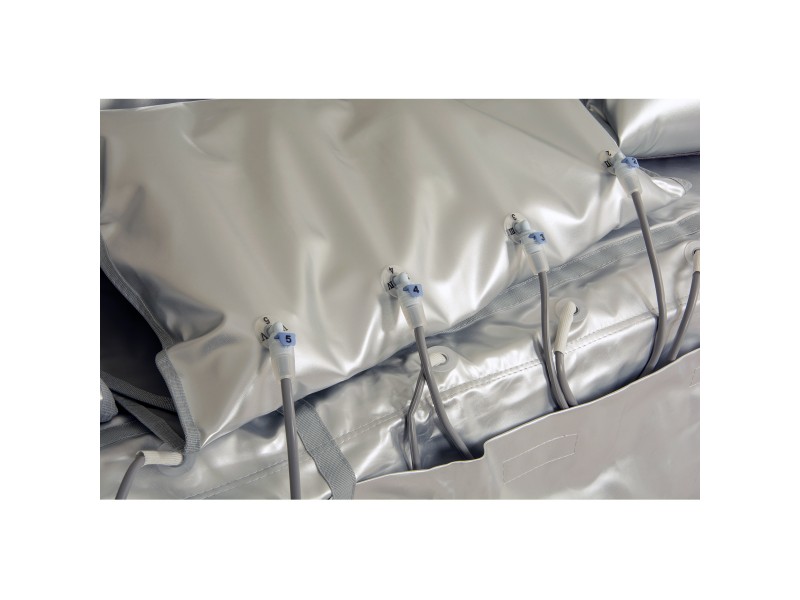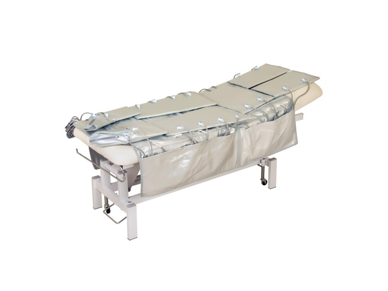 Пресокостюм оснащенний 20-ма повітряними камерами. Зручне під’єднання манжет до апарату відбувається через захисний чохол, який розміщений на кушетці. На шлангах і на роз’ємах манжет зазначені номерки, відповідно до яких аксесуари підключаються до апарата. В чохлі передбачені бокові кишені, які звисають з боків кушетки – в них зручно зберігати деталі костюма, якщо апарат не використовується, або проводяться інші процедури. Чохол та манжети виготовлені з водонепроникного матеріалу (ПВХ), який легко чистити.