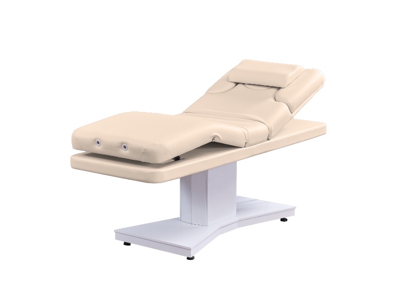 Багатофункціональний масажний стіл модель 3805F, біла база з електричним регулюванням налаштувань та вигином у ножній частині.