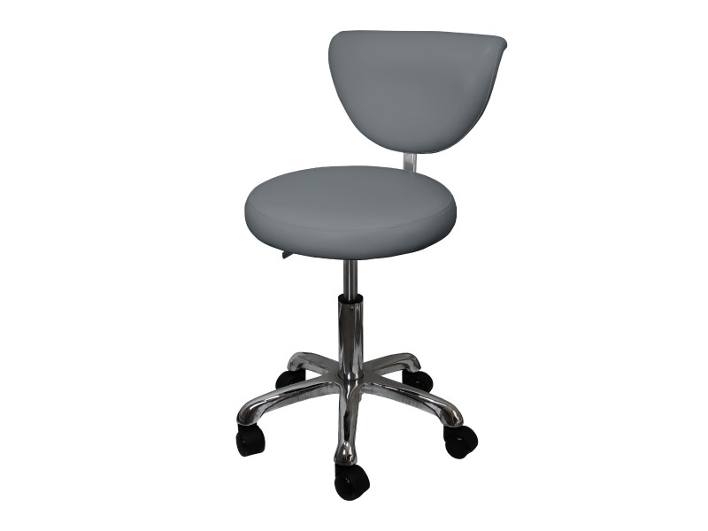 Стілець для майстра модель 850 сірого кольору зі зручним сидінням у вигляді таблетки та широкою спинкою для підтримки поперекового відділу. П'ятипроменева хрестовина з поліуретановими колесами забезпечує тихе і легке пересування.