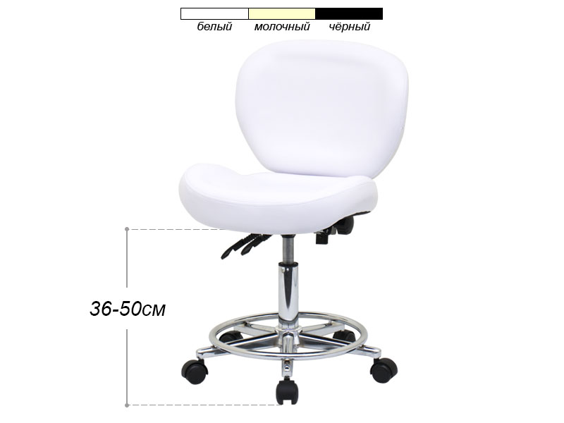 Стілець для майстра модель 881-2 білого кольору зі зручною широкою регулюючою спинкою й увігнутим сидінням забезпечує комфорт і практичність під час роботи для косметолога. Регулюючий механізм спинки дозволяє забеспечити максимально комфортне положення.